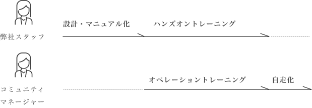 新施設に対するコミュニティマネジメント業務の設計やマニュアル化を行い、一定期間のハンズオントレーニングを元に、コミュニティ運営チームが自走する立ち上げ支援プログラムを用意しております。
